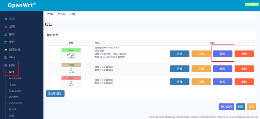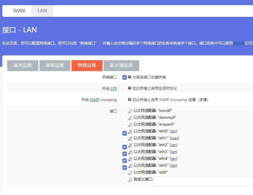 然后,点击上方的物理设置,选上你想用作lan的物理网口,然后保存并应用,就大功告成了。